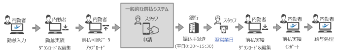 はやく現金が欲しいスタッフと、作業工数が多くストレスのかかる派遣会社、この双方のジレンマは大きな問題となっていました。前払い対応が当たり前になっている人材派遣会社でさえも、この事務作業を手作業で即日に処理しきることは非常に困難なのです。