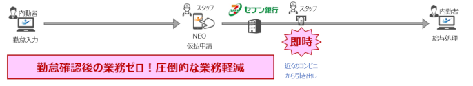 一番の強みは、申請と同時にリアルタイムで銀行口座に振り込みがおこなわれるという点です。当日の振り込み処理ではなく、リアルタイム(即時)での振り込み(着金)です。前払いの申請と同時に、近くにあるコンビニからでもさくっと現金を引き出すことができるため、スタッフにとってはとても便利です。