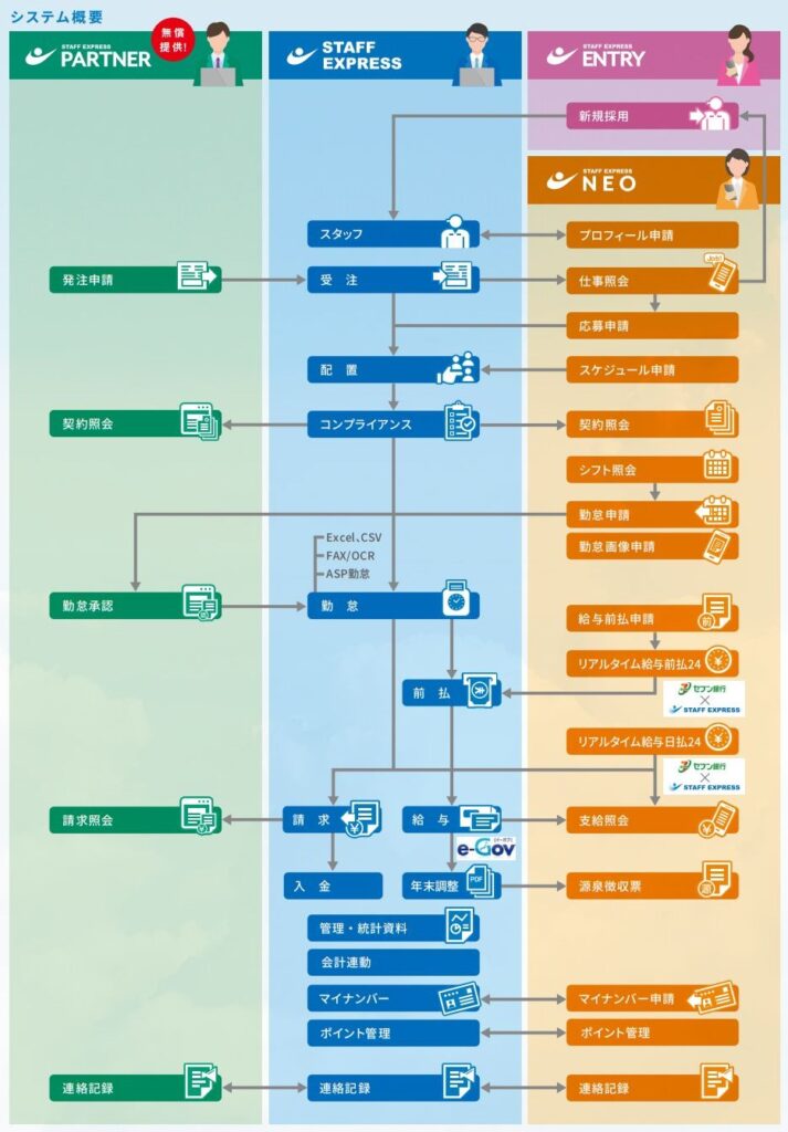 さらに派遣スタッフと連携が取れるSTAFF EXPRESS NEO(スタッフエクスプレスネオ)や派遣先企業向けのSTAFF EXPRESS PARTNER(スタッフエクスプレスパートナー)などの付帯サービスも活用することにより、人材派遣会社の業務効率は改善していきます。