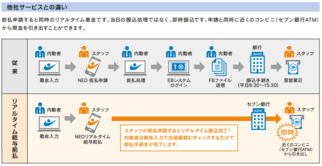 これは、24時間365日いつでもリアルタイム(即時)に給与の日払い決済が作成される、金融とITを融合させた、業界初の画期的なFintech(フィンテック)サービスとなっています。