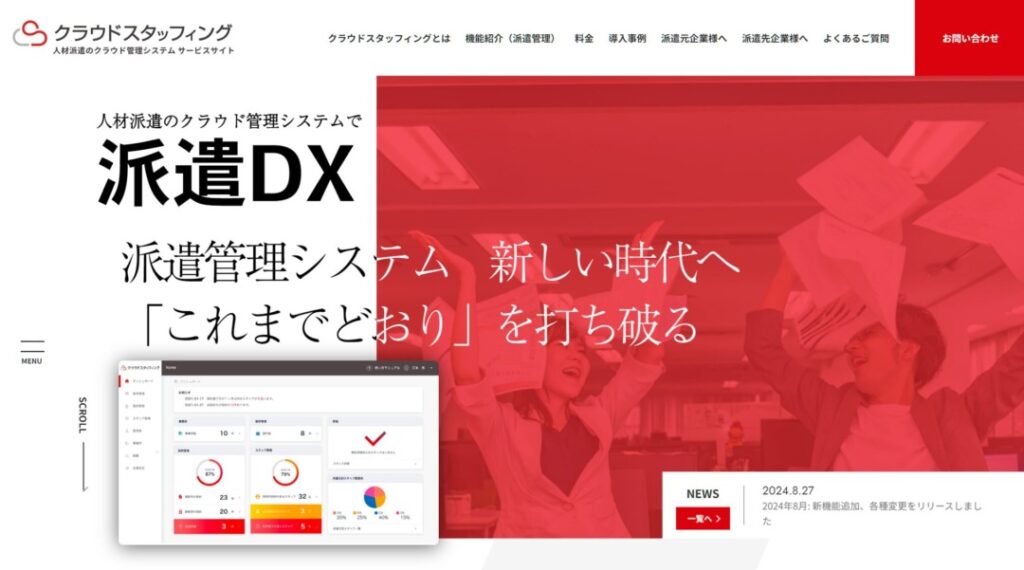 派遣管理業務のDX化に役立つクラウド管理システム「クラウドスタッフィング」は、株式会社クラウドスタッフィングが提供するサービスです。複雑になりがちな人材派遣業務を一括管理できます。