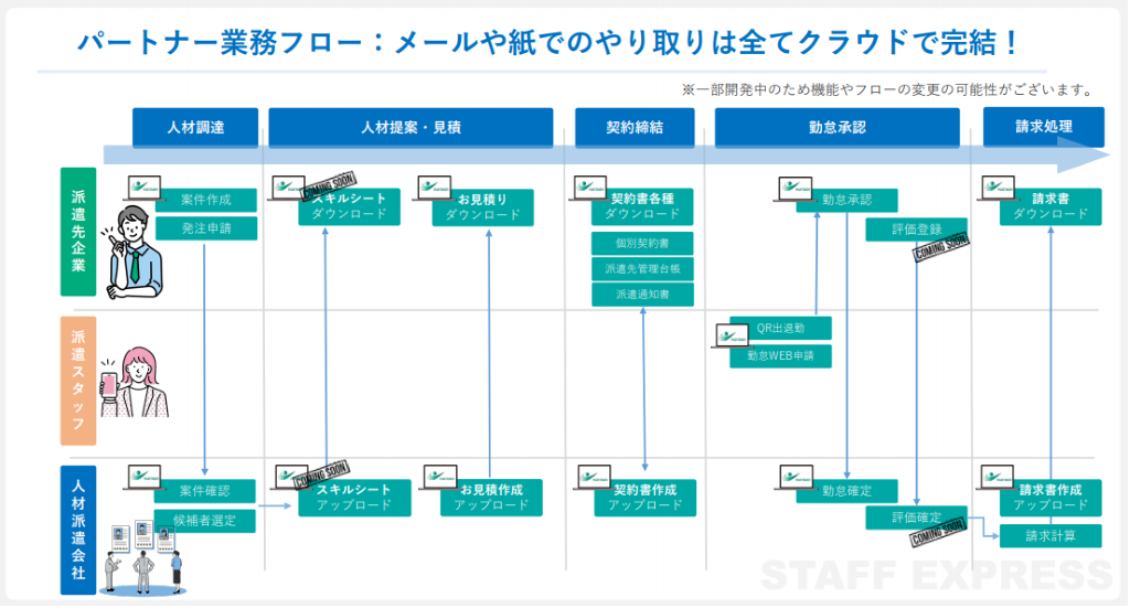 本システムと派遣会社の管理システム「STAFF EXPRESS」と連動させれば、派遣会社・派遣先・派遣スタッフの3者間における各業務を効率化し、非対面でスムーズに業務を遂行できます。