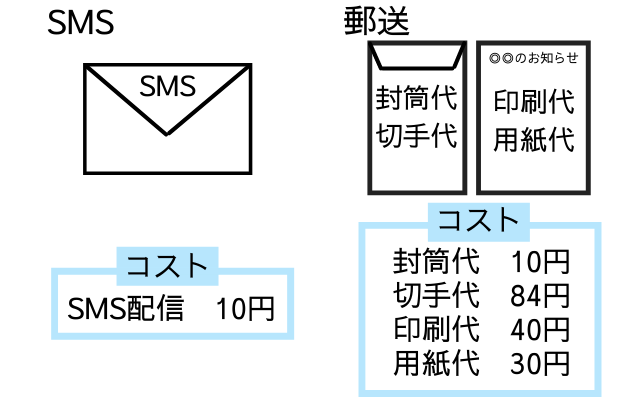 郵送の場合は「用紙代・印刷代・封筒代・切手代・人件費等」が発生します。『書面郵送1通で全て込み込みで200円近くかかる』こともあるのではないでしょうか。それを『SMS配信で行えば1通10円』という大幅なコストカットが実現します。