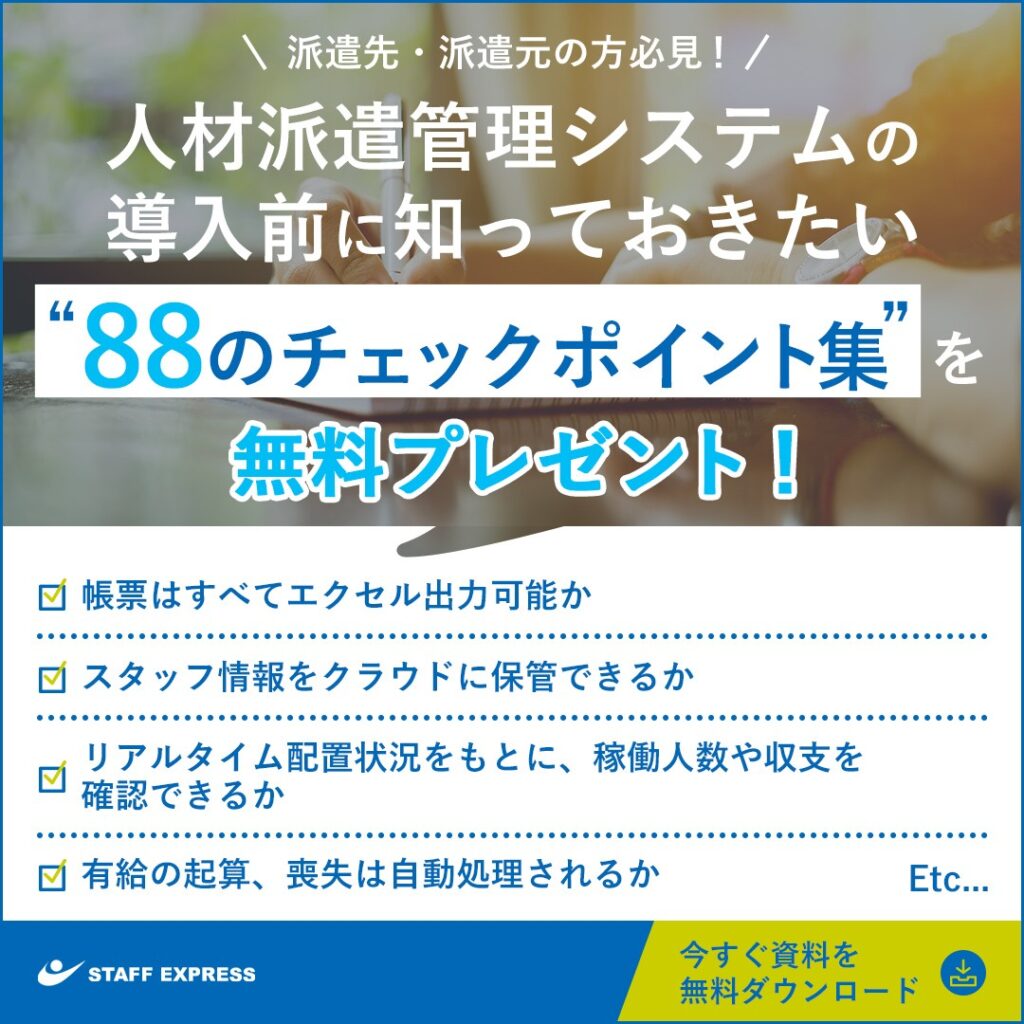 >>人材派遣管理システムを導入する前に必読!資料請求で「88のチェックポイント集」を無料でプレゼント<<