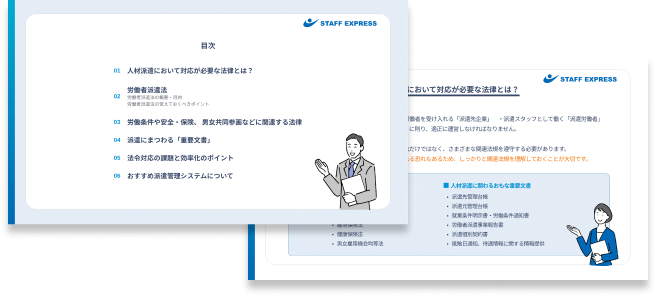 人材派遣に関係する法律、重要文書、法令対応の課題と効率化のポイント等についてまとめた資料です。